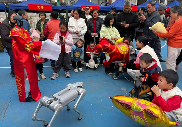 在夏郢镇政府前的球场上,智能机器人与社科普及志愿者联袂跳起新年主题舞蹈,灵活的动作配合喜庆的节奏,赢得现场阵阵掌声;仿生机器狗化身“科技财神”,在人群中穿梭送福、互动嬉戏,让年味与科技感完美交融。